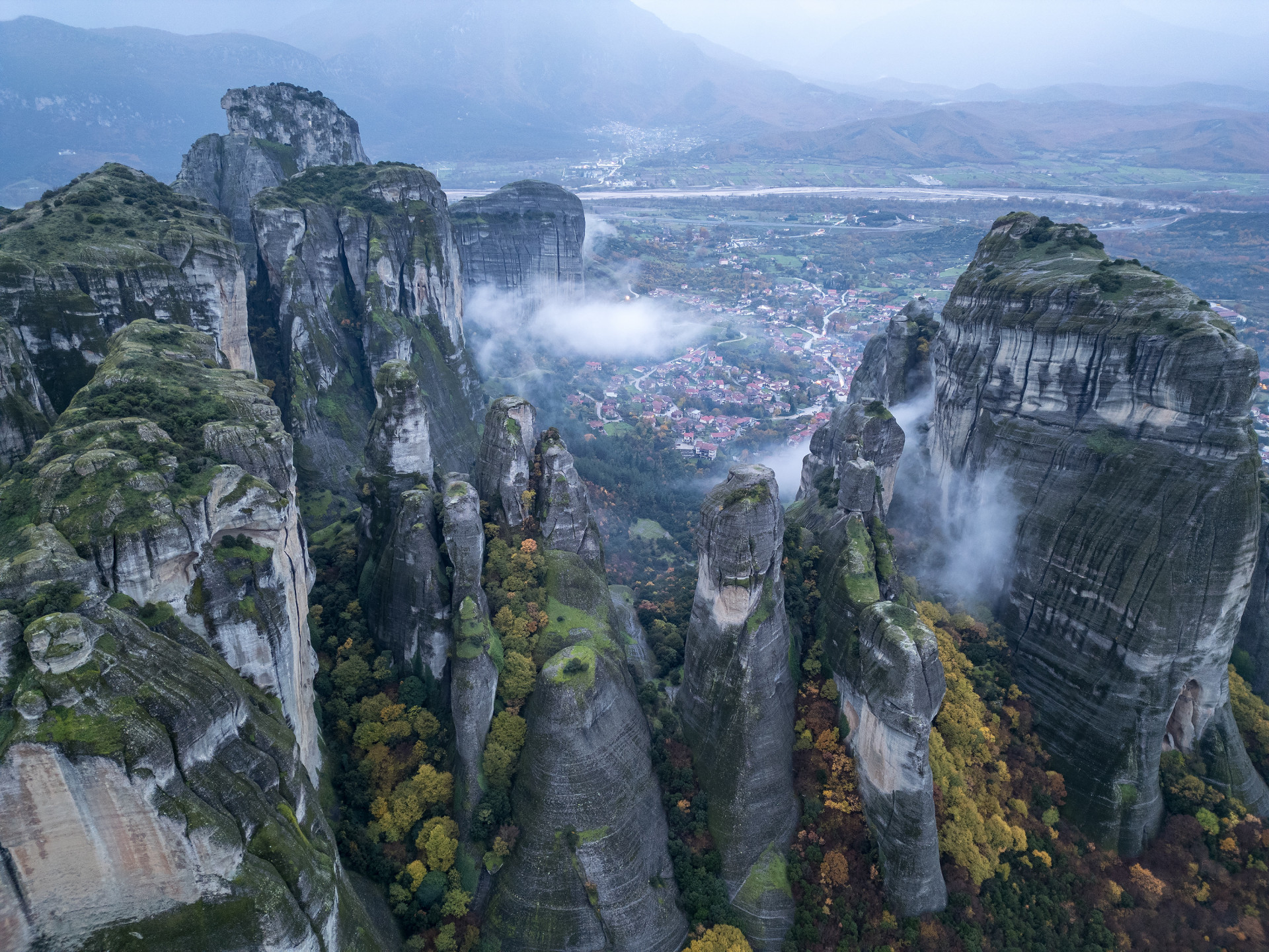 그리스 메테오라(Meteora)의 안개 낀 절벽 위에서, 시간마저 숨을 고르는 순간을 포착한 사진이 아련하네요.