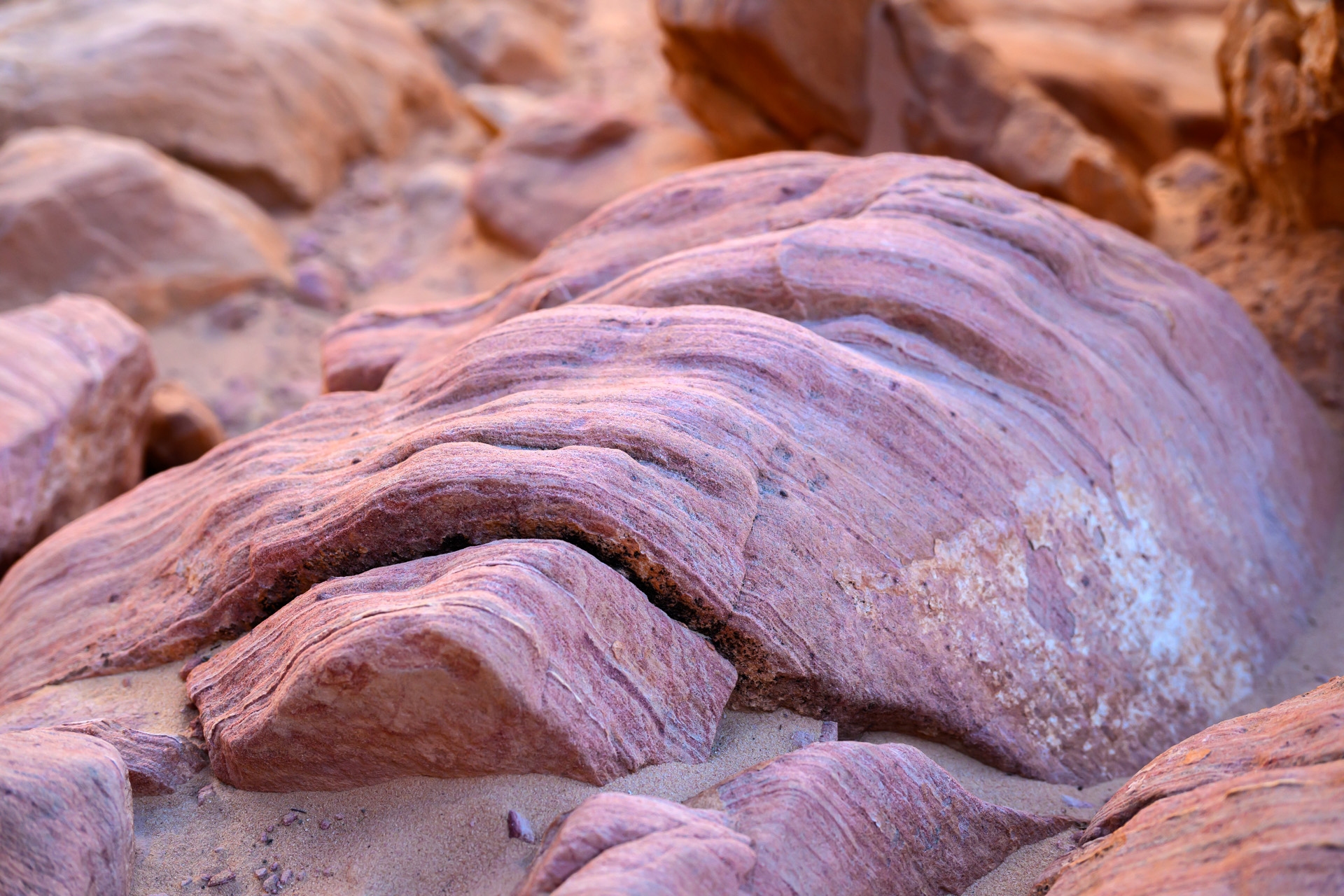 이 사암의 붉은색, 주황색, 노란색, 분홍색 등은 모두 철분(iron oxide) 의 산화 단계 차이에 의해 생긴 것입니다.