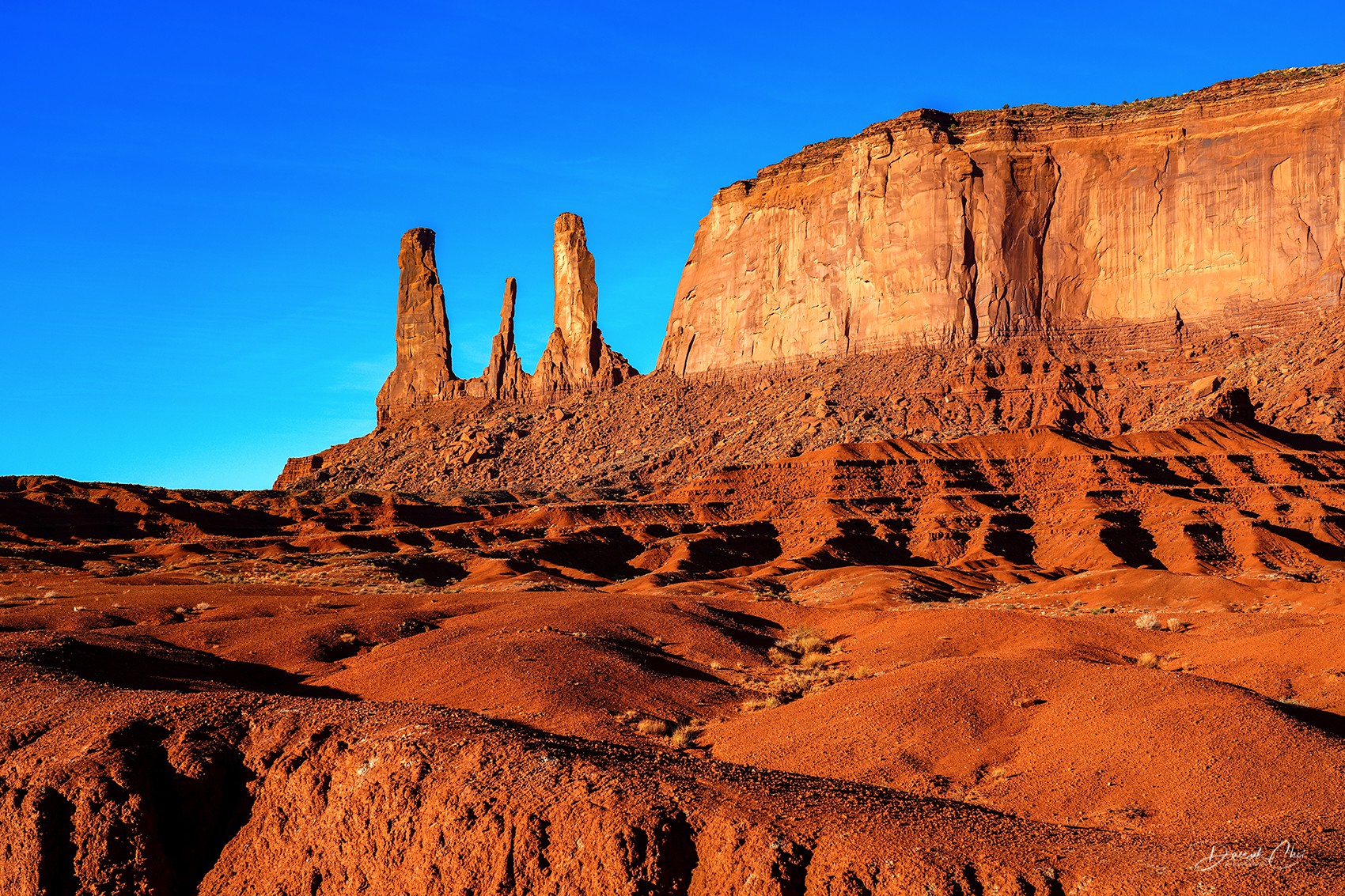 Towering red sandstone buttes, glowing at sunrise