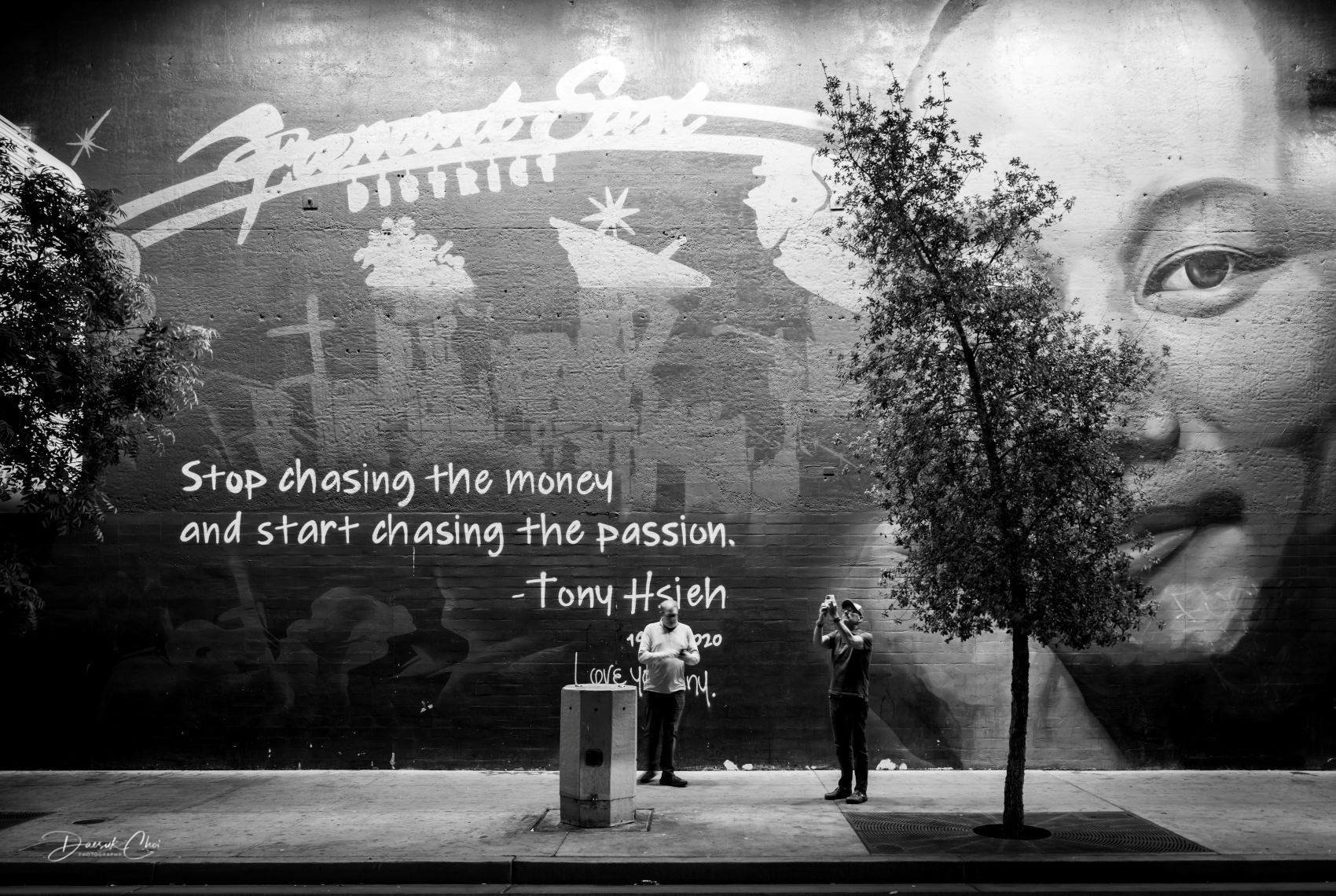 벽화의 인물에 대한 소개입니다. 미래가 촉망되는 유능한 청년이었는데 낙후된 라스베가스 다운타운지역을 위한 개발작업을 열심히 추진하던중 갑작스럽게 세상을 떠났습니다. 그래서 그 친구를 기리는 벽화에 그의 얼굴과 그가 평소에 늘 하던 말을 적었습니다. 그앞을 지나던 행인을 기다리던차 두사람이 사진촬영을 하는 장면이 포착되어 좋은 기회가 되었지요.