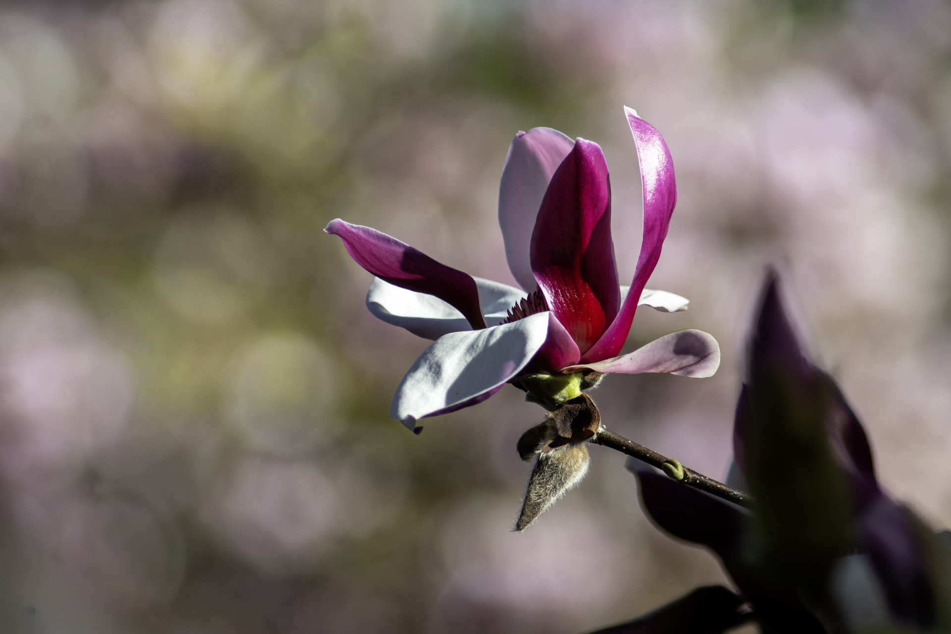 부드럽게 흩어진 배경 보케 위로 목련 한 송이가 또렷이 떠오르며,