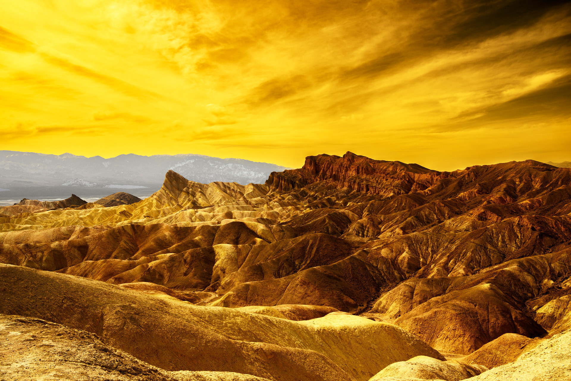 대스밸리 자브리스키 포인트의 침식된 능선 위로 노을빛이 스며들며, 대지의 주름과 결이 또렷하게 드러난 순간입니다. 금빛 하늘 아래 굴곡진 능선들이 파도처럼 이어지고, 멀리 산맥이 배경을 잡아 주어 사막의 광활함과 시간의 깊이를 함께 느끼게 합니다.